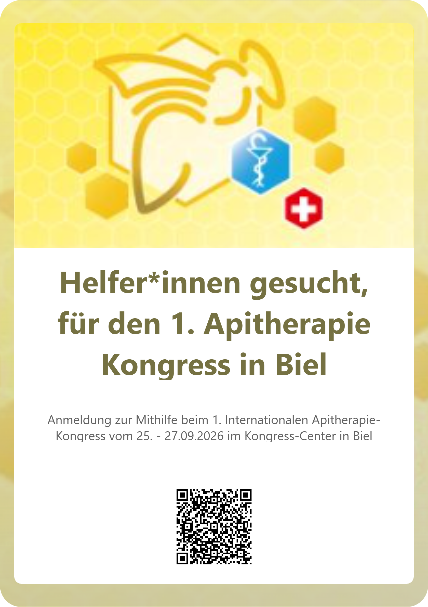 Wenn Sie Freude an Teamarbeit haben, Interesse an der Apitherapie mitbringen und Teil eines internationalen Anlasses sein möchten, freuen wir uns sehr über Ihre Kontaktaufnahme. Als Dankeschön bieten wir Einblick in spannende Fachvorträge, Verpflegung sowie ein wertschätzendes Miteinander.